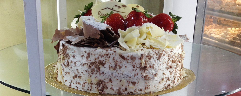 Ingredientes: pão-de-ló branco, recheado com Chantilly e cerejas, cobertura de Chantilly, decorado com raspas de chocolate branco , açúcar de confeiteiro e cerejas.