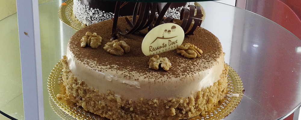 Ingredientes: pão-de-ló de chocolate, recheado com creme de nozes, cobertura de creme de chocolate, decorado com nozes.